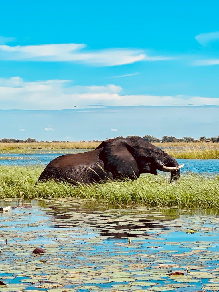 What better way to round off my African odyssey than with a safari in Chobe National Park, located in northern Botswana?! It’s a phenomenal destination that I first explored nearly 20 years ago. Chobe is notable for having the largest elephant population in Africa, estimated at 50,000. The park stretches over 5,000 sq miles/11,000 sq KM and incorporates riverfront, swamp, and woodland ecosystems. There were many indelible moments, but my two standout favorites were observing a solitary elephant cavorting in the Chobe River, snacking on water lilies, and coming across nearly 70 elephants along the riverbank downstream. Witnessing these colossal creatures in their natural habitat was an unforgettable experience.